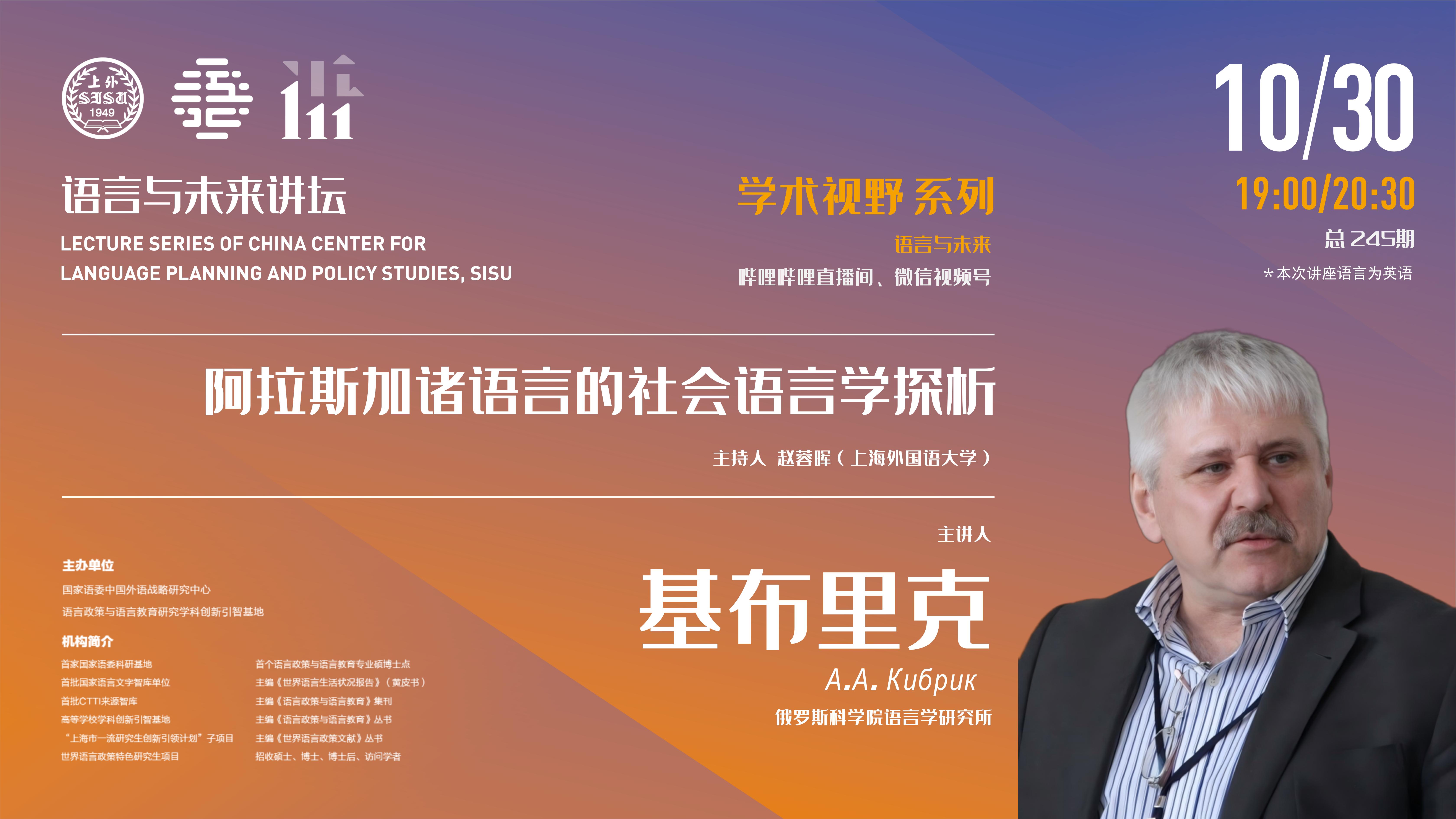 2025年10月30日,俄罗斯科学院语言学研究所基布里克教授做客中国外语战略研究中心“语言与未来讲坛”,做了题为《阿拉斯加诸语言的社会语言学探析》的学术讲座。本次讲座由中心执行主任赵蓉晖教授主持,百余位师生线上参加本次讲座。