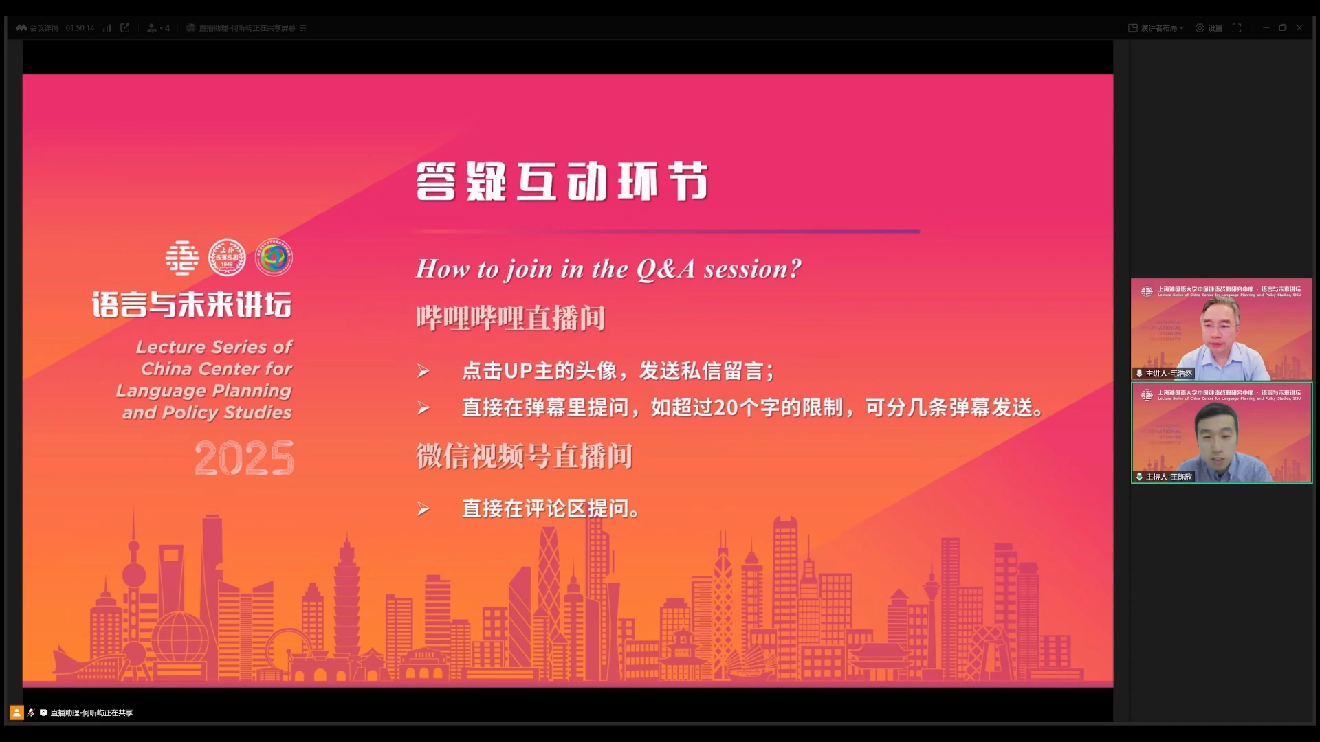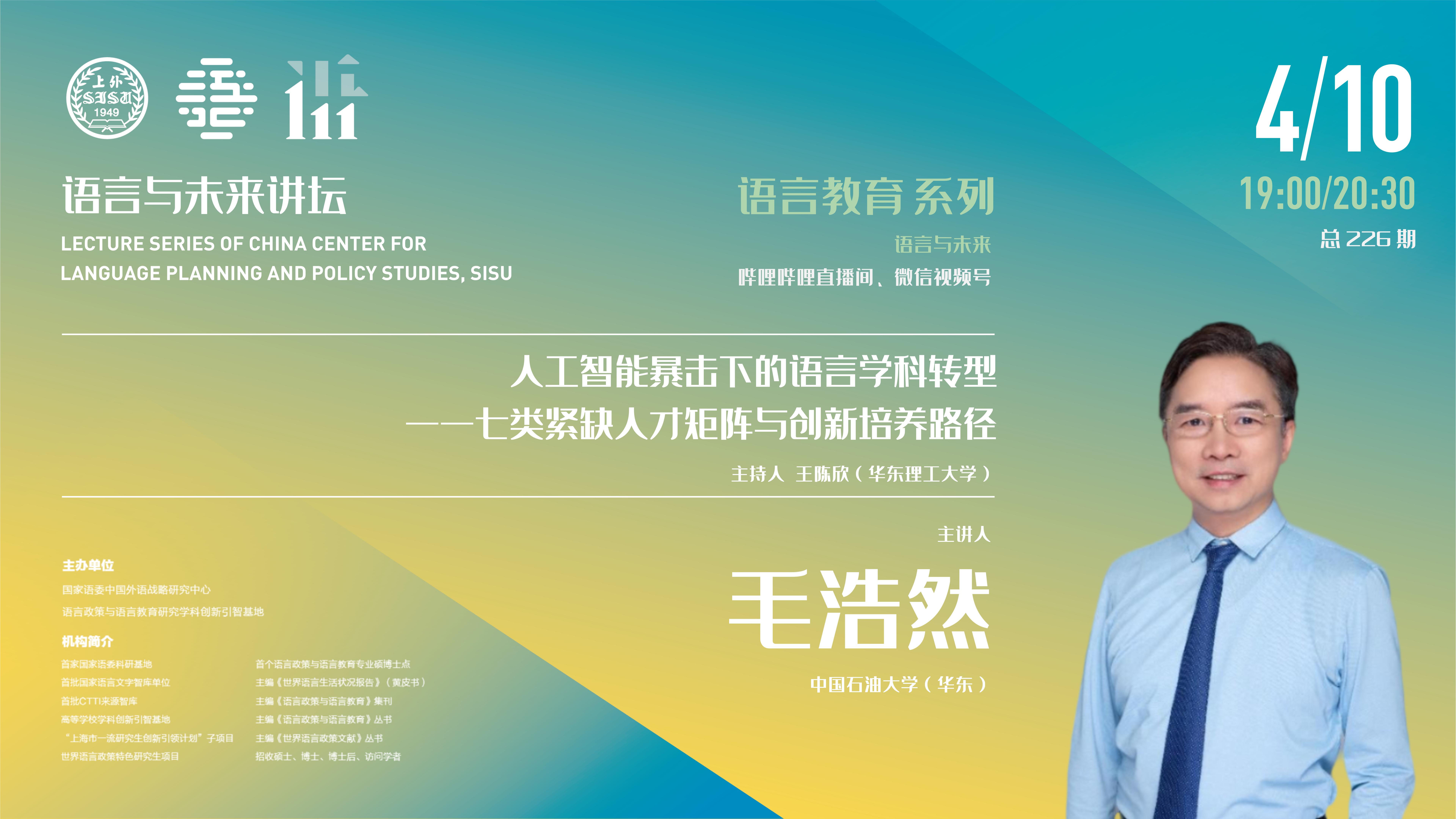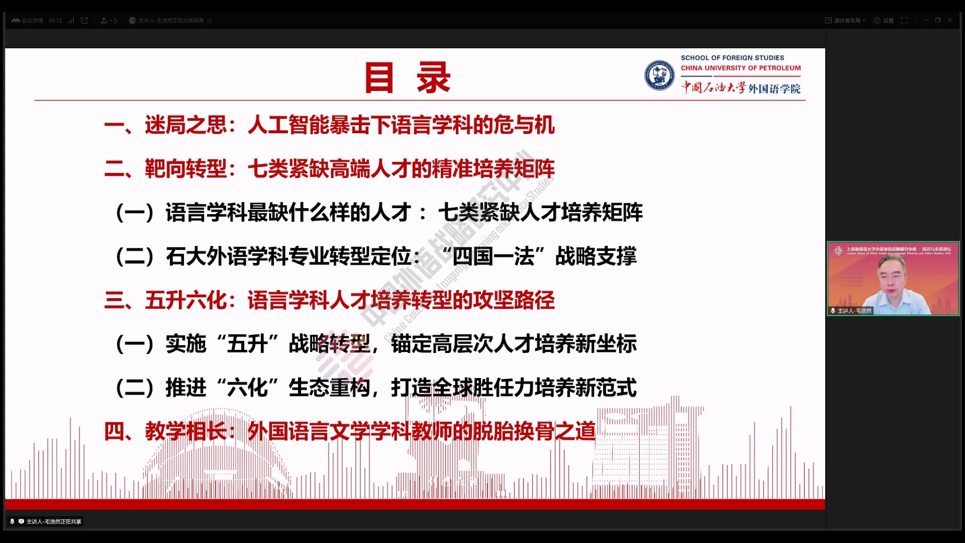 2025年4月10日,中国石油大学(华东)外国语学院院长毛浩然教授作客上海外国语大学“中国外语战略研究中心讲坛”,做了题为《人工智能暴击下的语言学科转型——七类紧缺人才矩阵与创新培养》的学术讲座。本次讲座由华东理工大学王陈欣博士主持,数百位校内外师生在线参加。