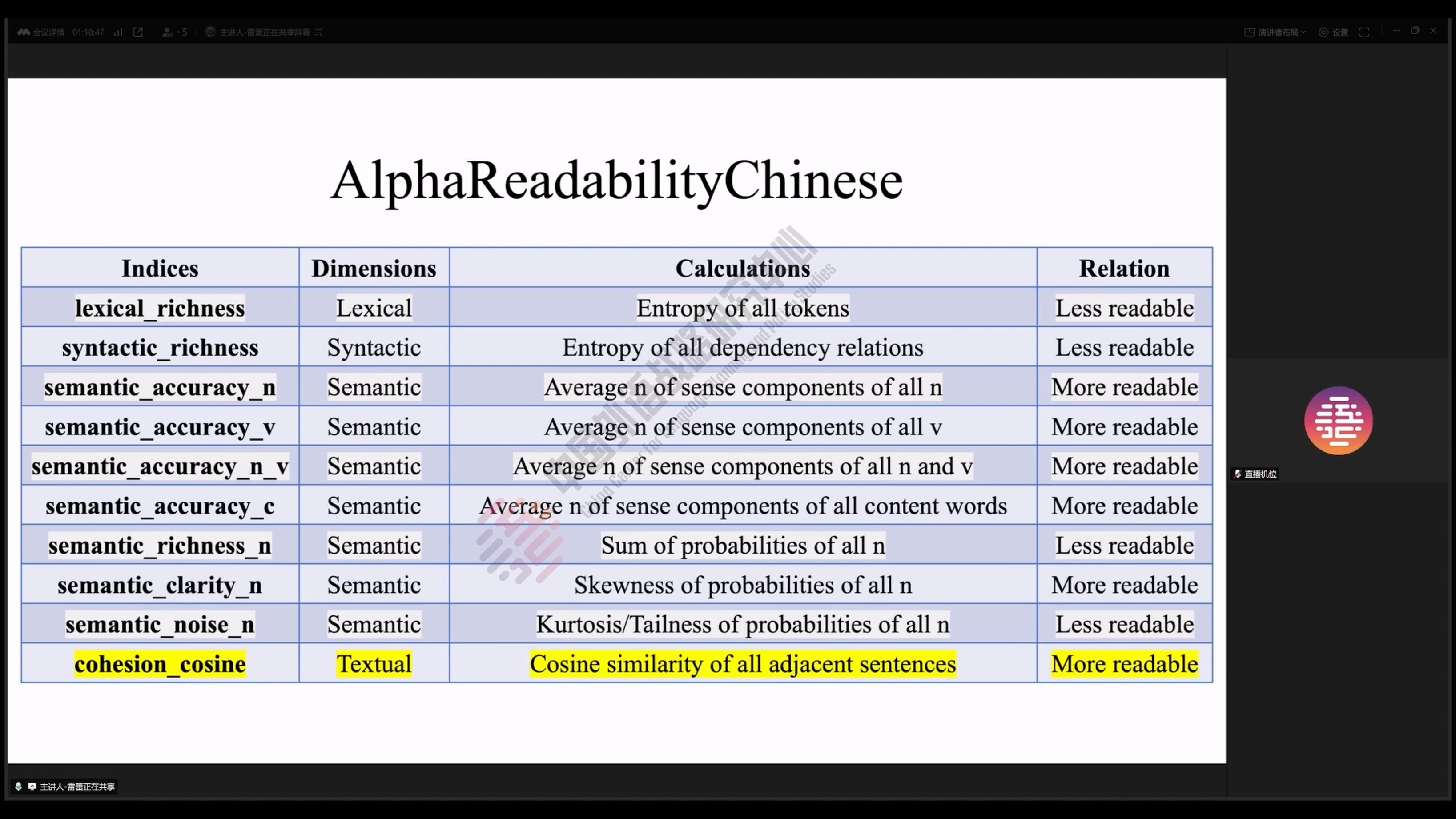 讲座伊始,雷蕾教授首先追溯可读性研究的历史脉络,指出自 20 世纪 50 年代以来,文本可读性评估在教育领域需求迫切,如教材编写、语言水平测试等场景均需科学的难度控制方法。除教育外,医学、金融、信息科学等领域也对文本难度测量有实际需求,例如医院知情同意书的易读性优化、上市公司年报的可读性与股市表现关联等。他强调,现有研究多聚焦英文,汉语研究虽起步较早,但仍以词汇、句法层面的浅层指标为主,语义和语篇层面的深入分析较少。针对现有研究不足,雷教授团队开发了汉语可读性评估工具Alpha Readability Chinese。该工具突破传统,构建了包含词汇、句法、语义的多维度指标体系,即词汇与句法、语义、语篇。