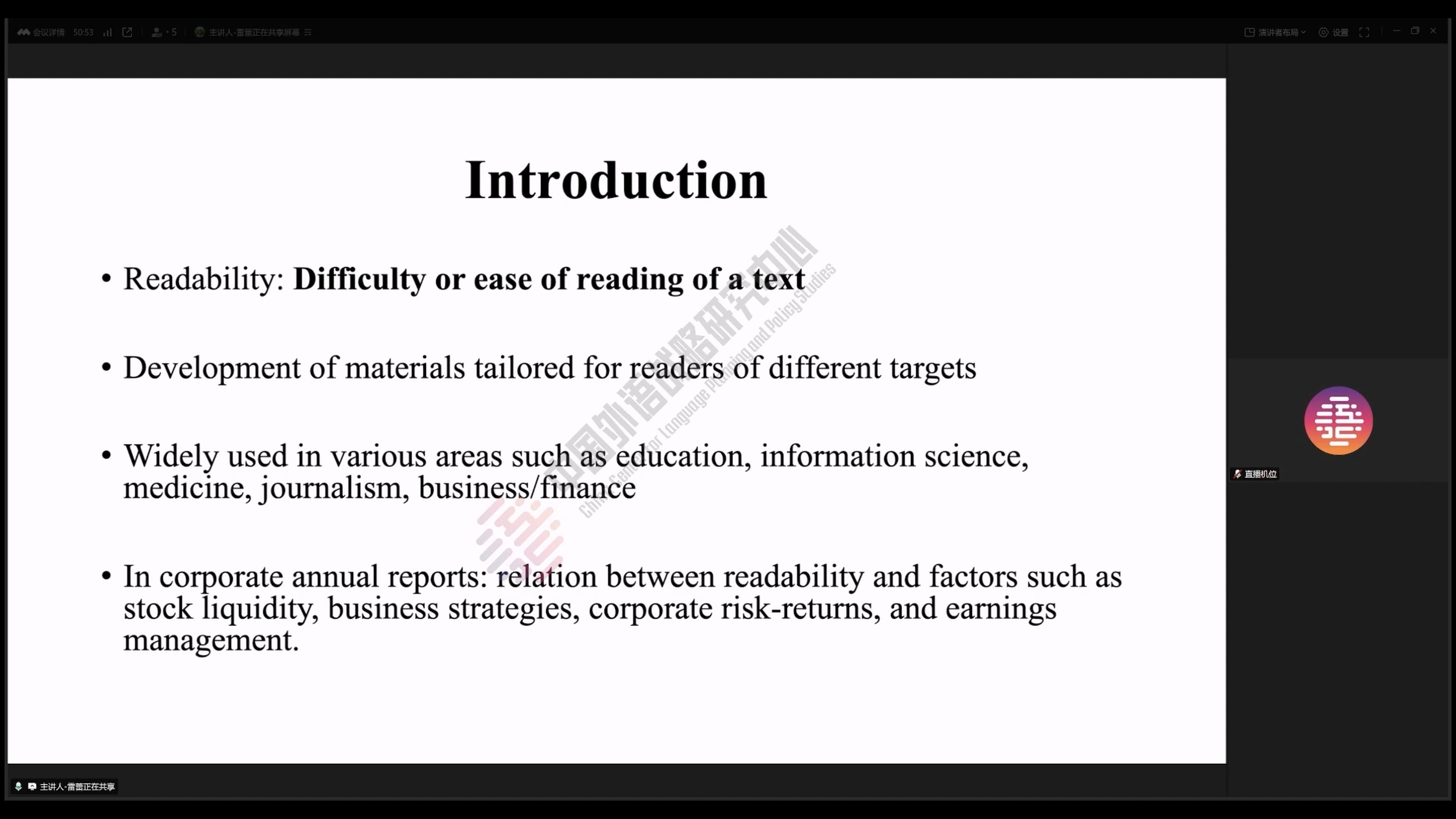 2025年5月22日,上海外国语大学语言科学研究院蕾蕾教授做客中国外语战略研究中心“语言与未来讲坛”,做了题为《汉语文本可读性研究:测量与应用》的学术讲座。本次讲座由上海外国语大学语言科学研究院李晶洁教授主持,数百名师生线上参加了本次讲座。