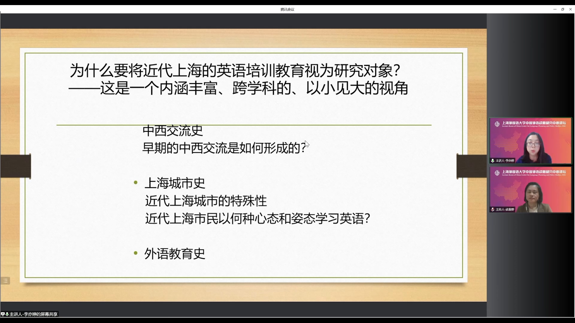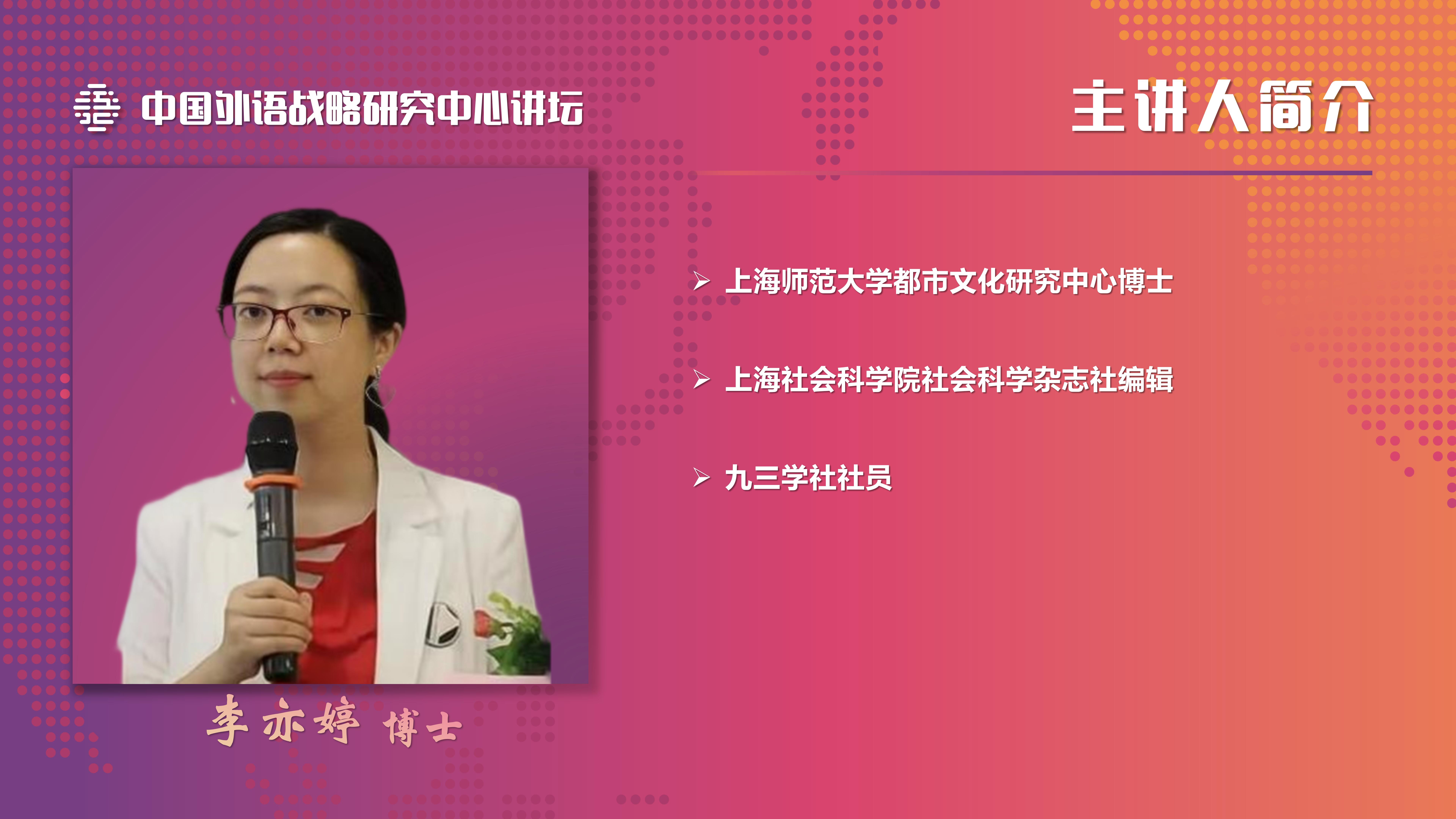 2022年5月17日晚,上海师范大学都市文化研究中心博士、上海社会科学院社会科学杂志社编辑李亦婷做客“中国外语战略研究中心讲坛”,做了题为《近代英语教育与社会变迁》的学术讲座。讲座由中心助理研究员武春野主持,来自全国各大高校和研究机构的师生以在线的方式参加了本次讲座。