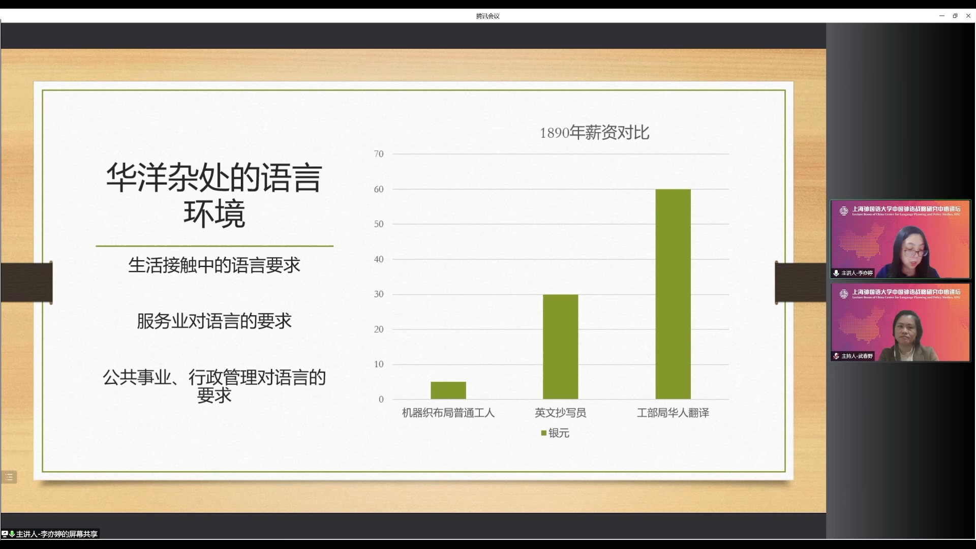 本次讲座以语言为切入口,重现了上海这座城市融入世界图景的曲折跌宕过程,揭示外语培训班与近代上海社会转型之间的深刻关联。李老师以语言为窗口,观察近代上海的发展和变化,并将其置于近代中国百年社会变迁的历史大背景下,视角新颖,以小见大,也启发着听众要善于将语言作为一个敏感的指示器,留心观察生活中的语言现象,探索语言与社会的共变关系。