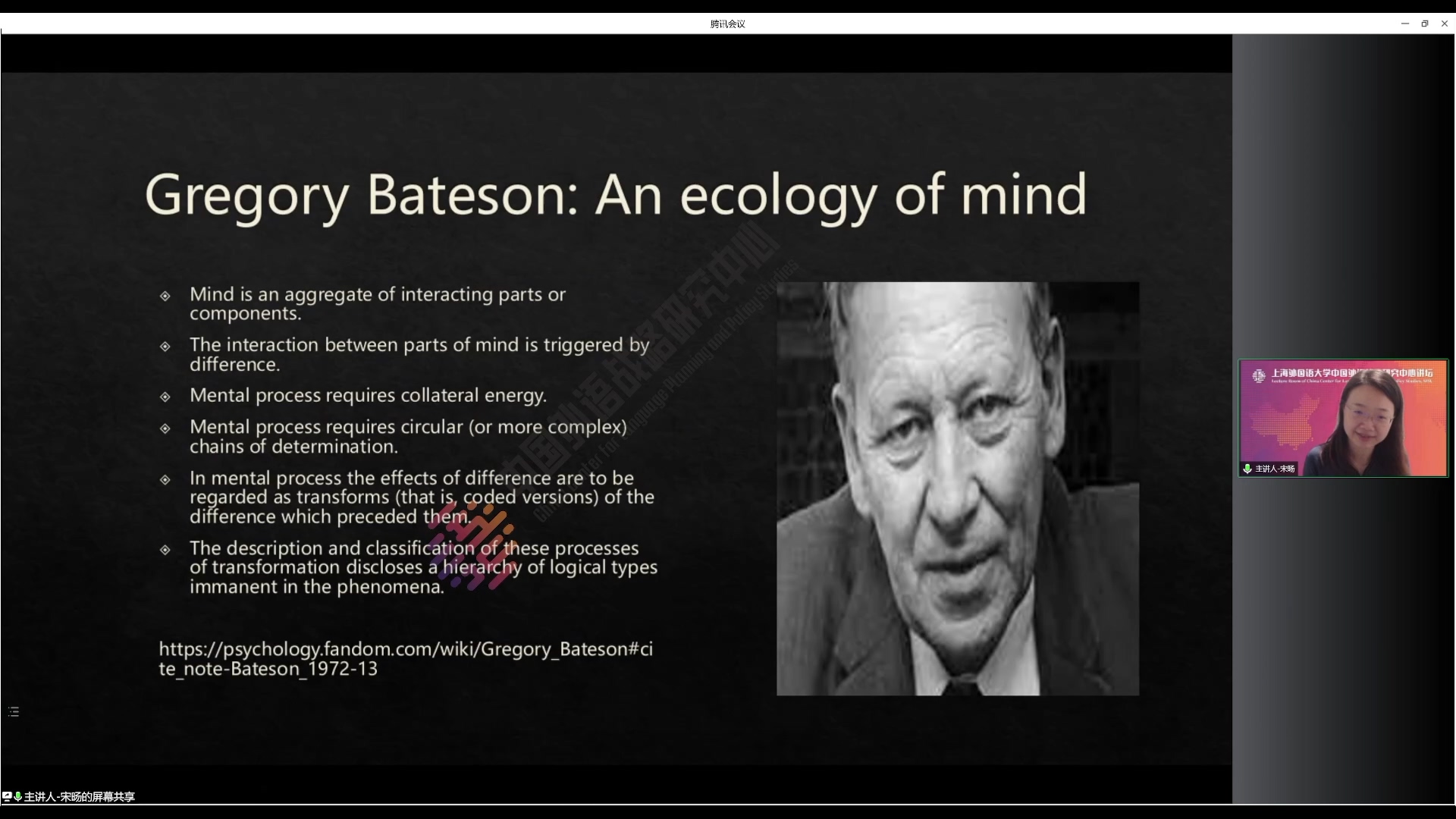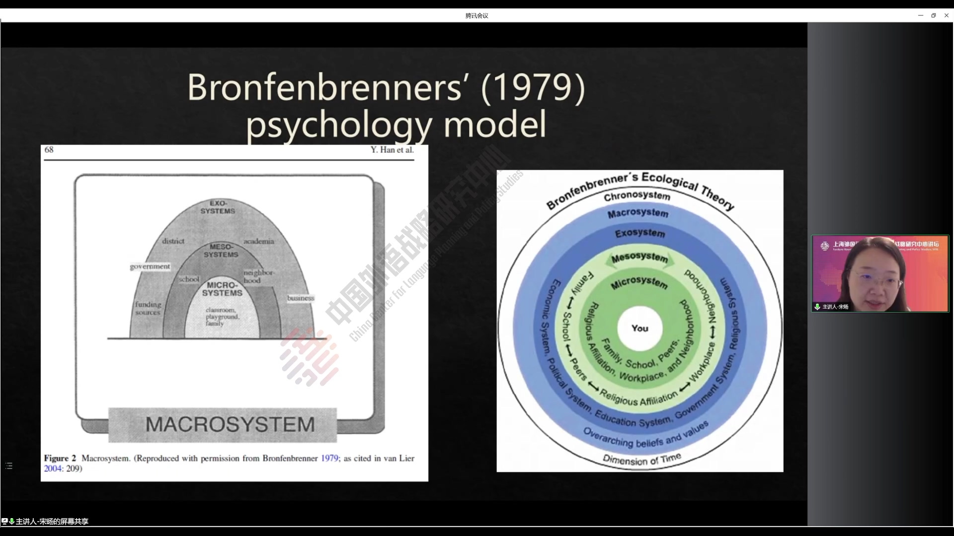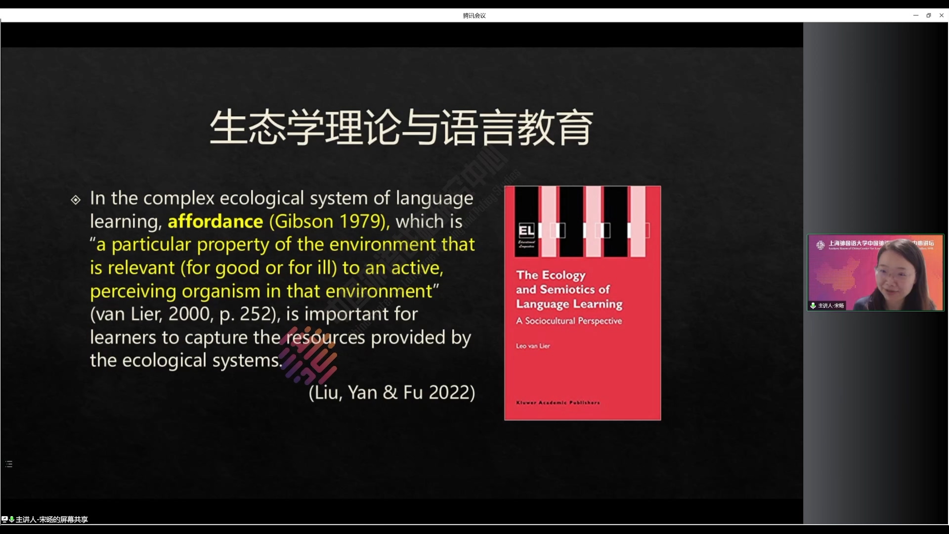 讲座伊始,宋旸副教授从维果斯基的社会文化理论切入,介绍了生态学理论在语言教育领域的应用。语言教育领域的生态学研究受到多个学科领域关于生态概念的影响,宋老师分别介绍了Gregory Bateson的心智生态学理论、Bronfenbrenner的生态系统理论以及van Lier的洋葱隐喻和affordance(潜势)概念。