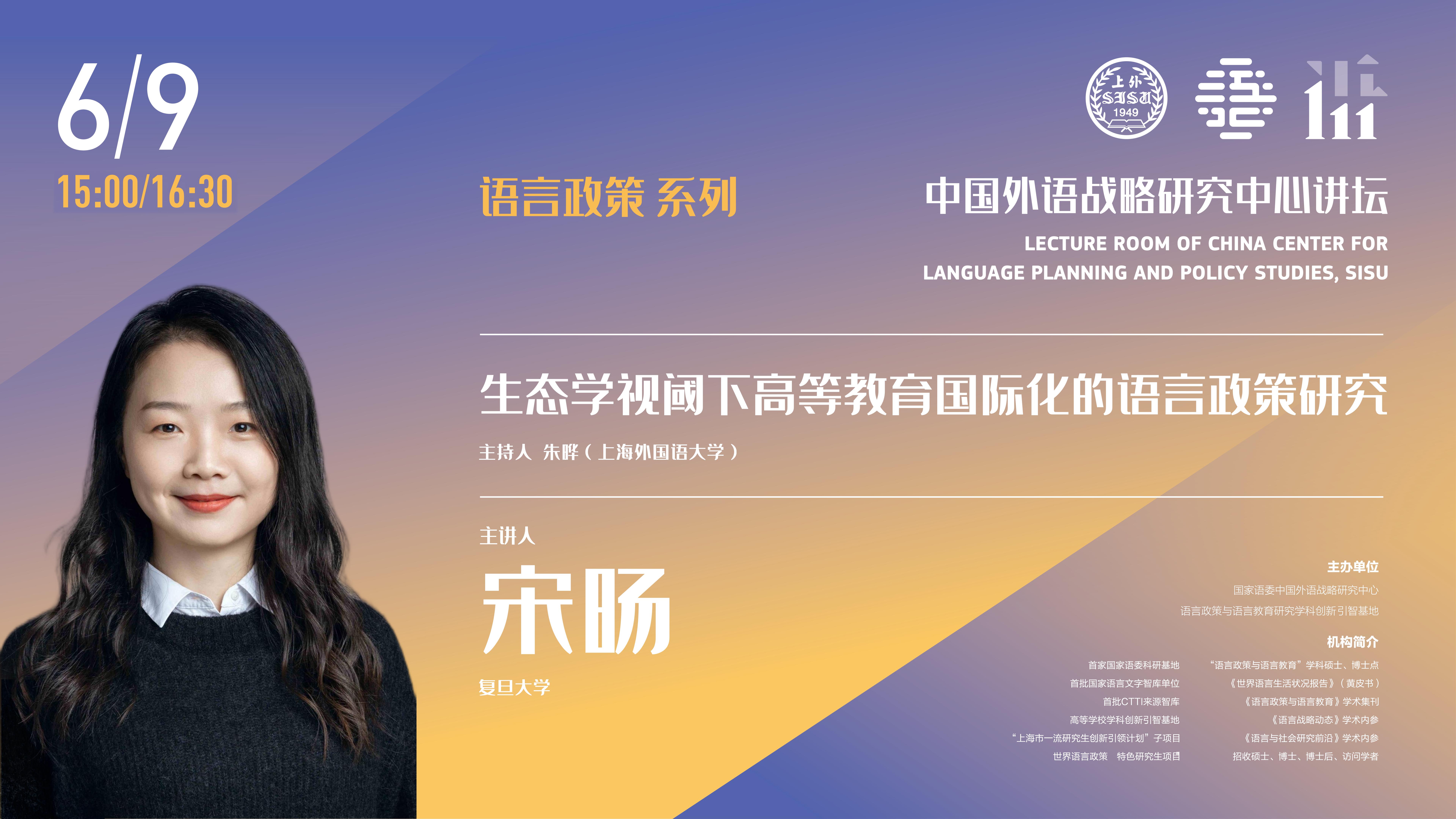 2022年6月9日,复旦大学外文学院宋旸副教授为“中国外语战略研究中心讲坛”带来题为《生态学视阈下高等教育国际化的语言政策研究》的学术讲座。讲座由中国外语战略研究中心副主任朱晔副教授主持,近400位校内外师生在线参加。