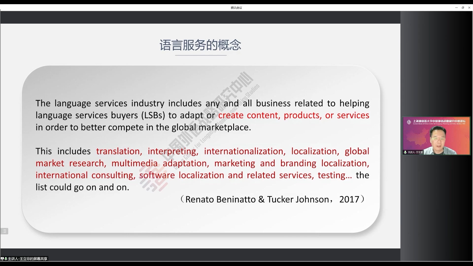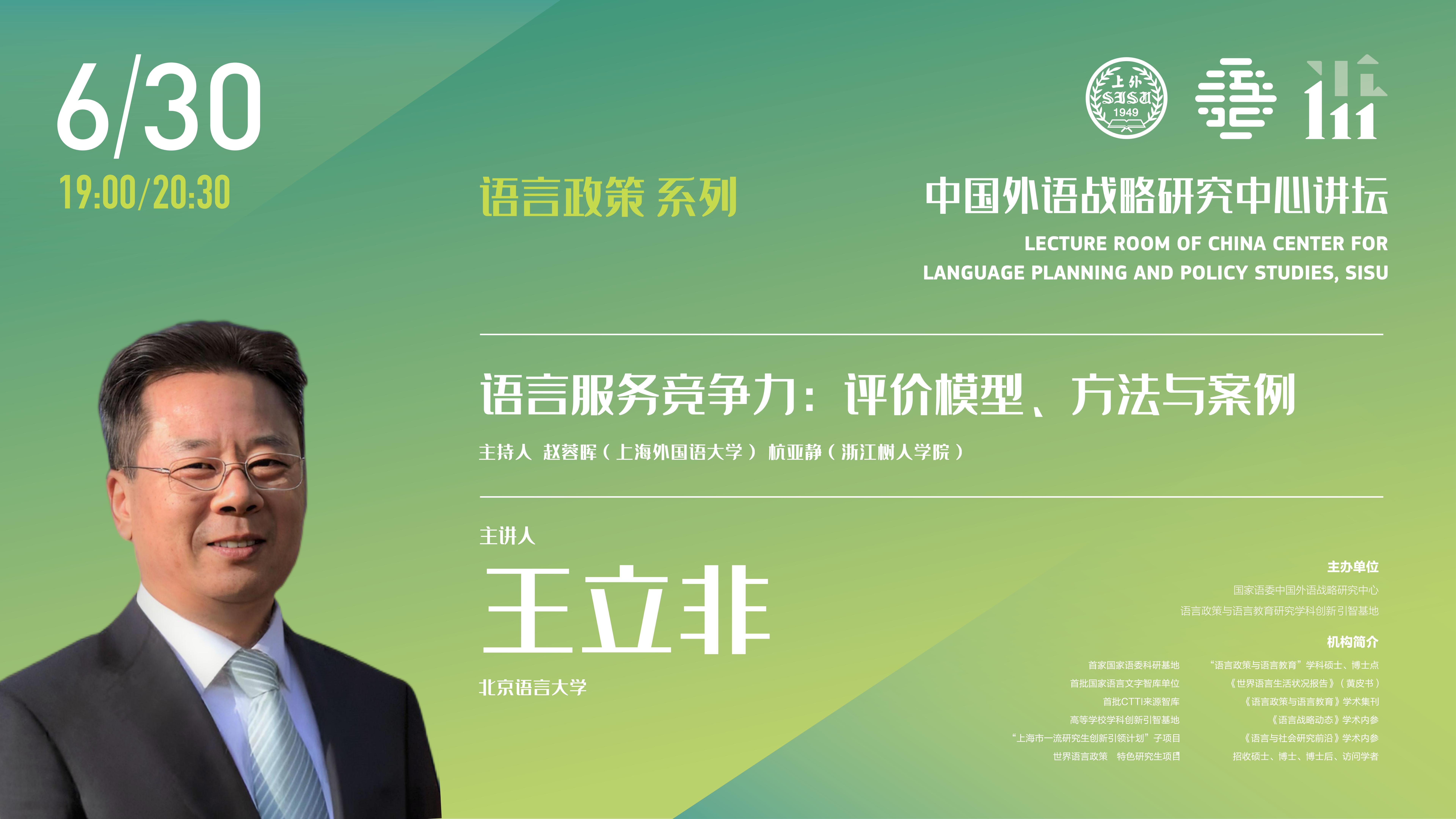 2022年6月30日晚,北京语言大学国际语言服务研究院院长王立非教授做客“中国外语战略研究中心讲坛”,做了题为《语言服务竞争力:评价模型、方法与案例》的学术讲座。讲座由上海外国语大学中国外语战略研究中心执行主任赵蓉晖教授和浙江树人学院杭亚静博士联袂主持,400余位校内外师生在线参加。