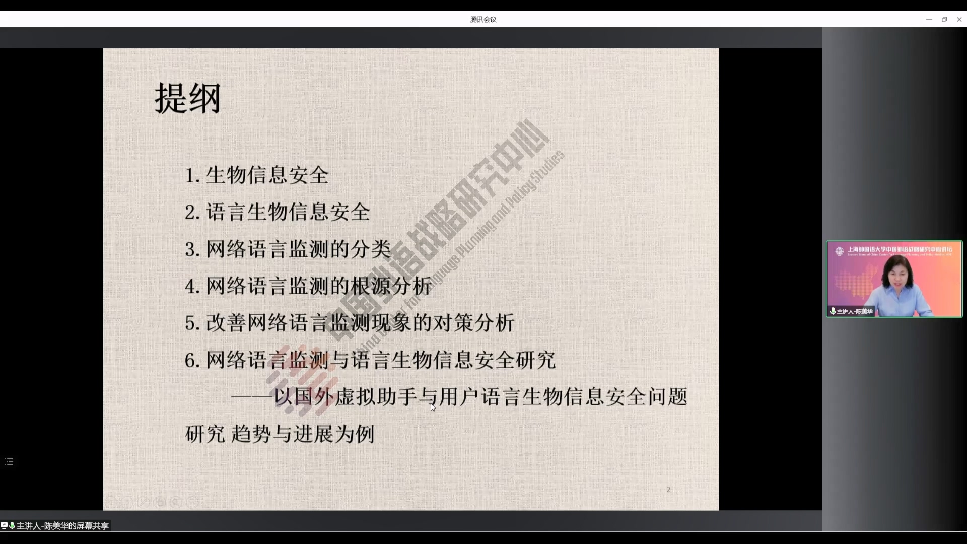 讲座伊始,陈美华教授首先介绍了生物信息安全和语言生物信息安全的概念。她指出,人类个体及群体语言表现出可识别的特征属性,从中能够提取可识别、可重复的生物特征样本数据。语言生物信息安全研究将生物安全与语言学科结合,对公民的信息安全、国家的战略布局、学科视野的延展、语言学习的深化具有重要意义。随后,陈老师阐述了网络语言监测的分类,对网络语言监测进行了根源分析,并对此进行对策分析。她将网络语言监测分为三类,包括用户浏览文字监测、用户输入文字监测、用户被动语音监测等,从商家、供应商和法律三方面解释了网络语言监测现象的根源,即以商业利益为终极目标的市场竞争、供应商过度操纵用户个人信息,以及法律监管有待完善。针对这些现象,陈老师提出如下对策,完善个人生物信息保护的法制建设、明确网络服务商保护用户生物信息安全的主体责任、提升用户对个人语言生物信息的重视程度和保护能力。接着,陈老师从研究方法、研究结果、研究主题、关键趋势多方面出发,以国外虚拟助手与用户语言生物信息安全问题研究为例,探讨如何结合我国实际情况开展网络语言监测与语言生物信息安全研究,为我国语言生物信息安全问题提供思路和启示。