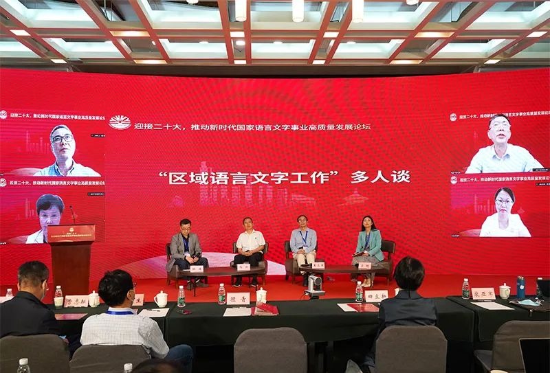 多人谈环节,学界专家与地方语委代表就语言文字工作展开了热烈的讨论交流。大家聚焦数字化时代的语言生活,从数字化对语言和语言学研究的影响、语言文字信息化工作、智能语言服务、术语建设、融媒辞书发展、古文字研究传承、语言文字教育、特殊人群语言服务等方面发表各自观点;又从高质量推进区域语言文字工作切入,聚焦语言文字工作如何服务区域建设,科技如何助力推进语言文字治理体系构建等话题,分享区域语言文字治理经验,畅谈语言文化事业如何服务于国家的发展大局。