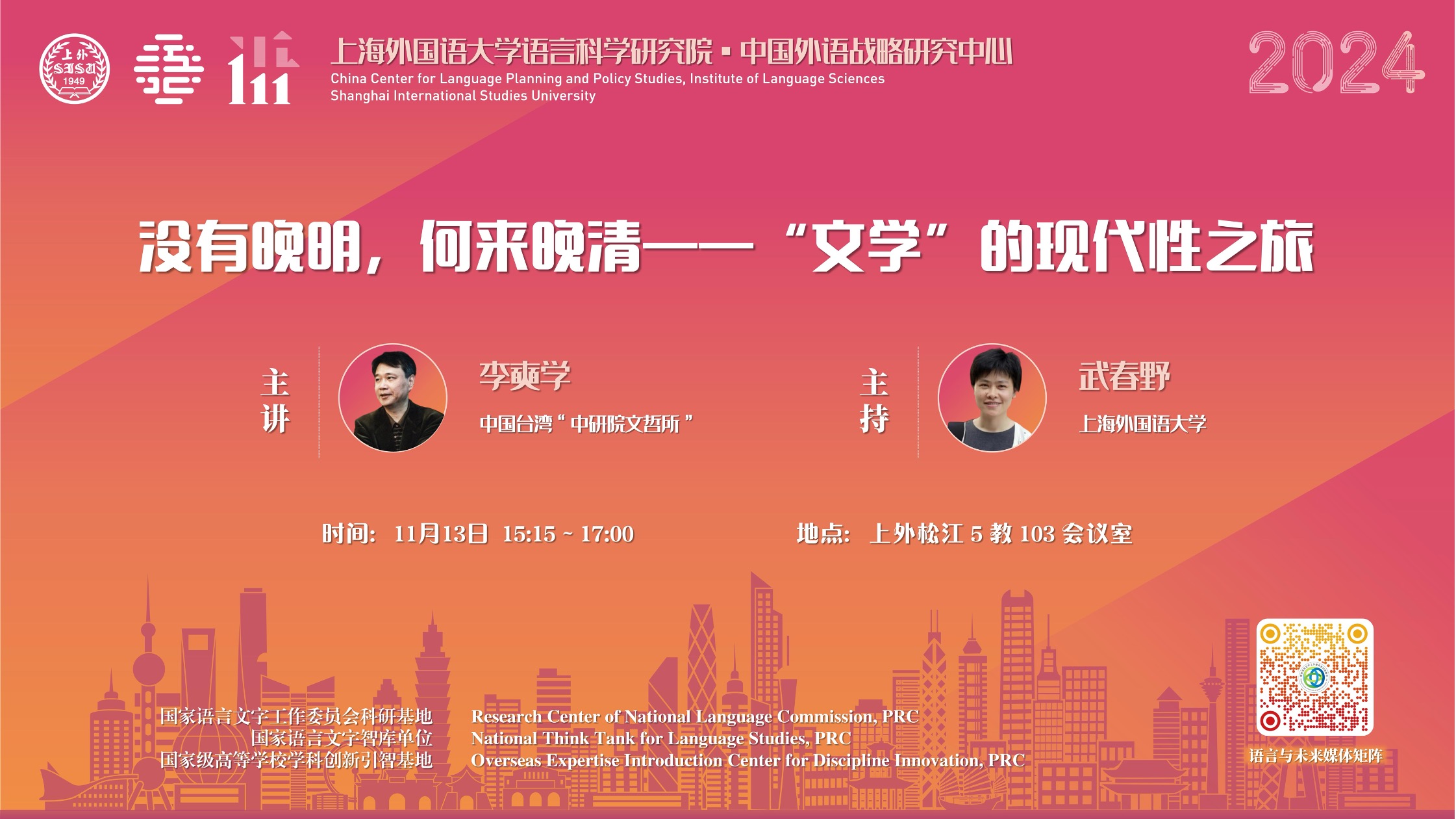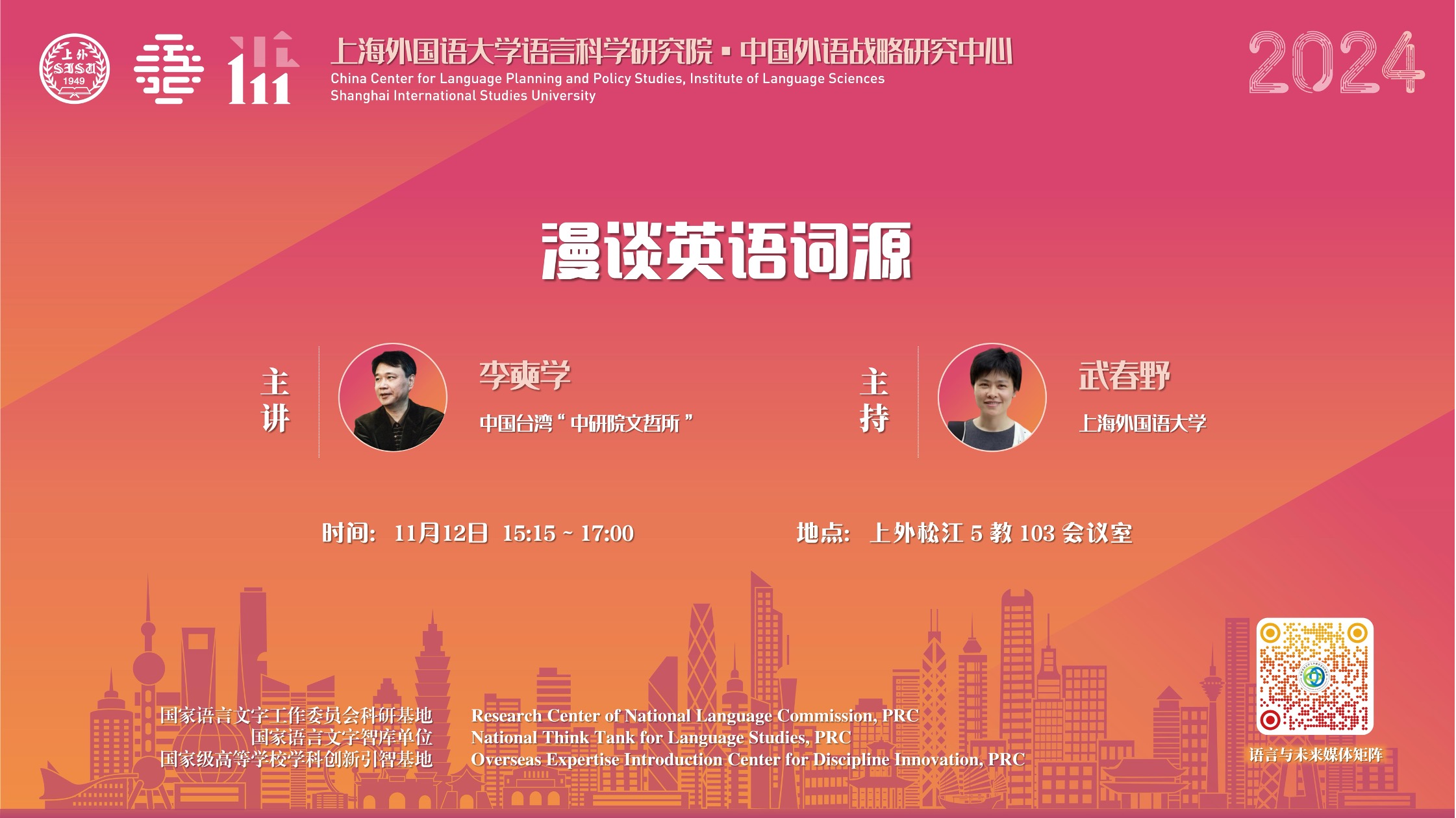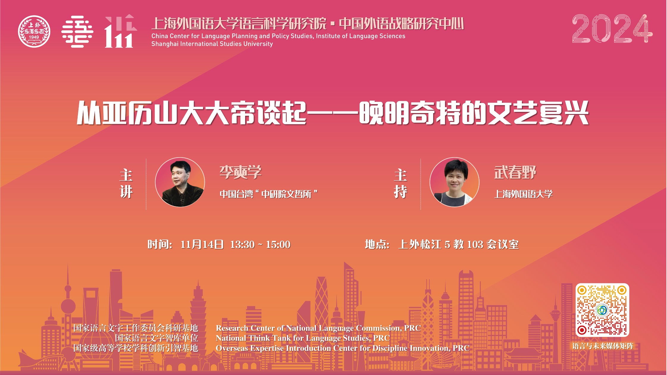 2024年11月12日至14日,中国台湾中研院文哲所特聘研究员、台湾师范大学翻译研究所合聘教授、台湾辅仁大学跨文化研究所校聘讲座教授李奭学老师莅临上海外国语大学,为上外师生带来了三场讲座。讲座由上海外国语大学语言科学研究院、国家语委科研基地中国外语战略研究中心承办。讲座围绕“语言与社会变迁”为主题展开,为师生呈现了一场融合语言学、文学、翻译史、中西文化交流史的学术盛宴。
