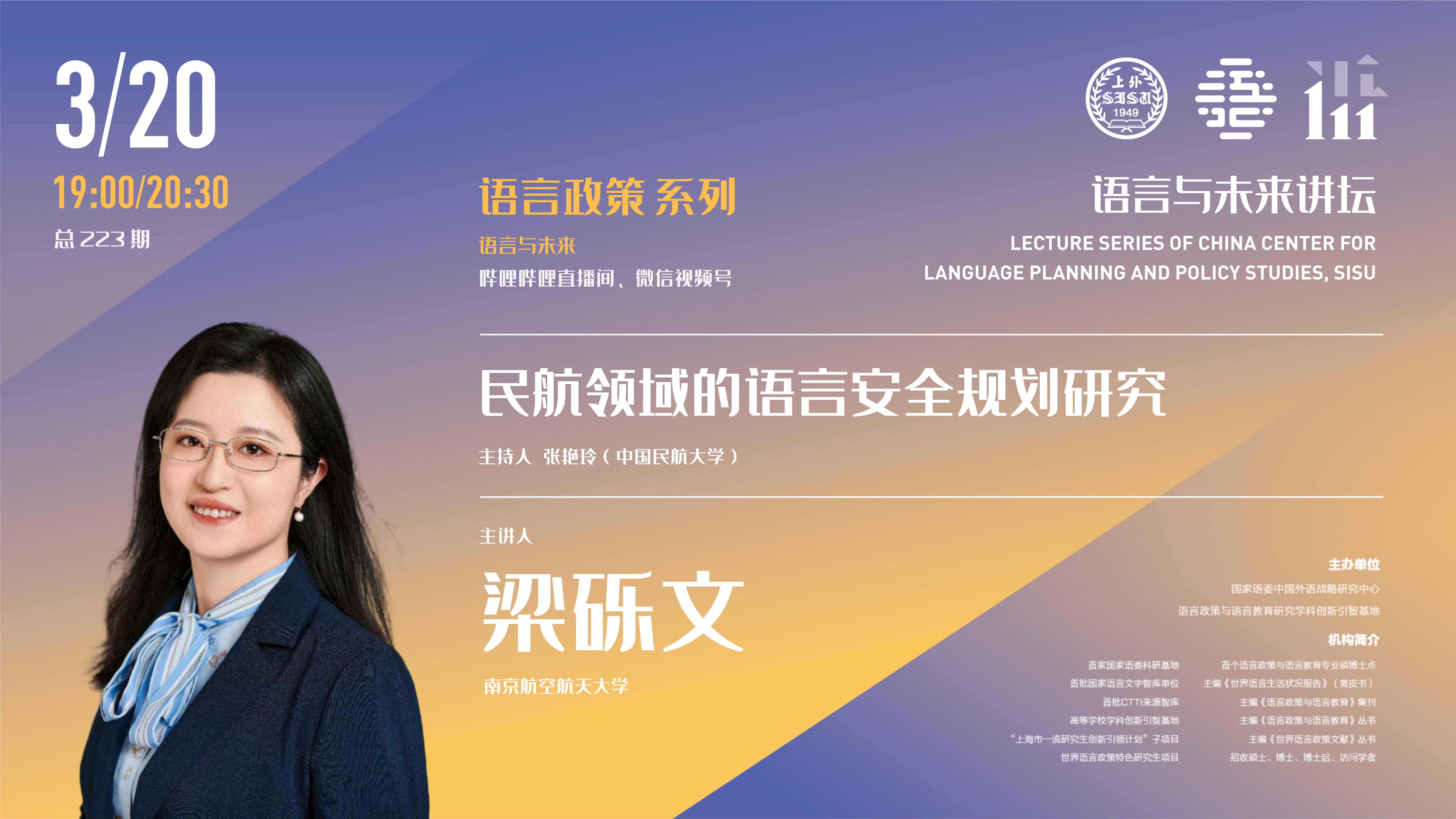 梁砾文,南京航空航天大学外国语学院副教授,硕士生导师,研究兴趣包括民航语言研究、语言规划与政策、学术语言研究。主持国家语委年度课题、江苏省研究生教改课题、中国外语战略研究中心“世界语言与文化研究”课题、中国民航科学技术研究院的民航安全研究课题、江苏省社科精品工程项目等。在《语言文字应用》、《外语界》、《外语教育研究前沿》、《外语研究》、《语言政策与规划研究》等发表论文30余篇,参与国家语委《中国语言生活报告》及《世界语言生活报告》撰写,获中国社会语言学青年学人奖。