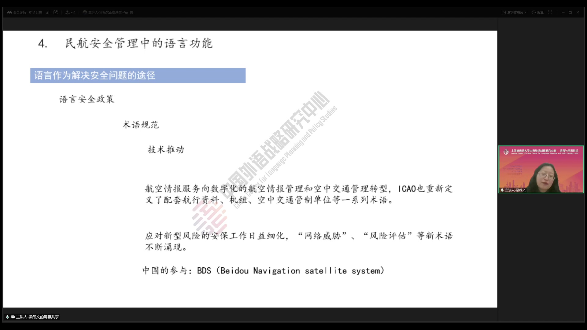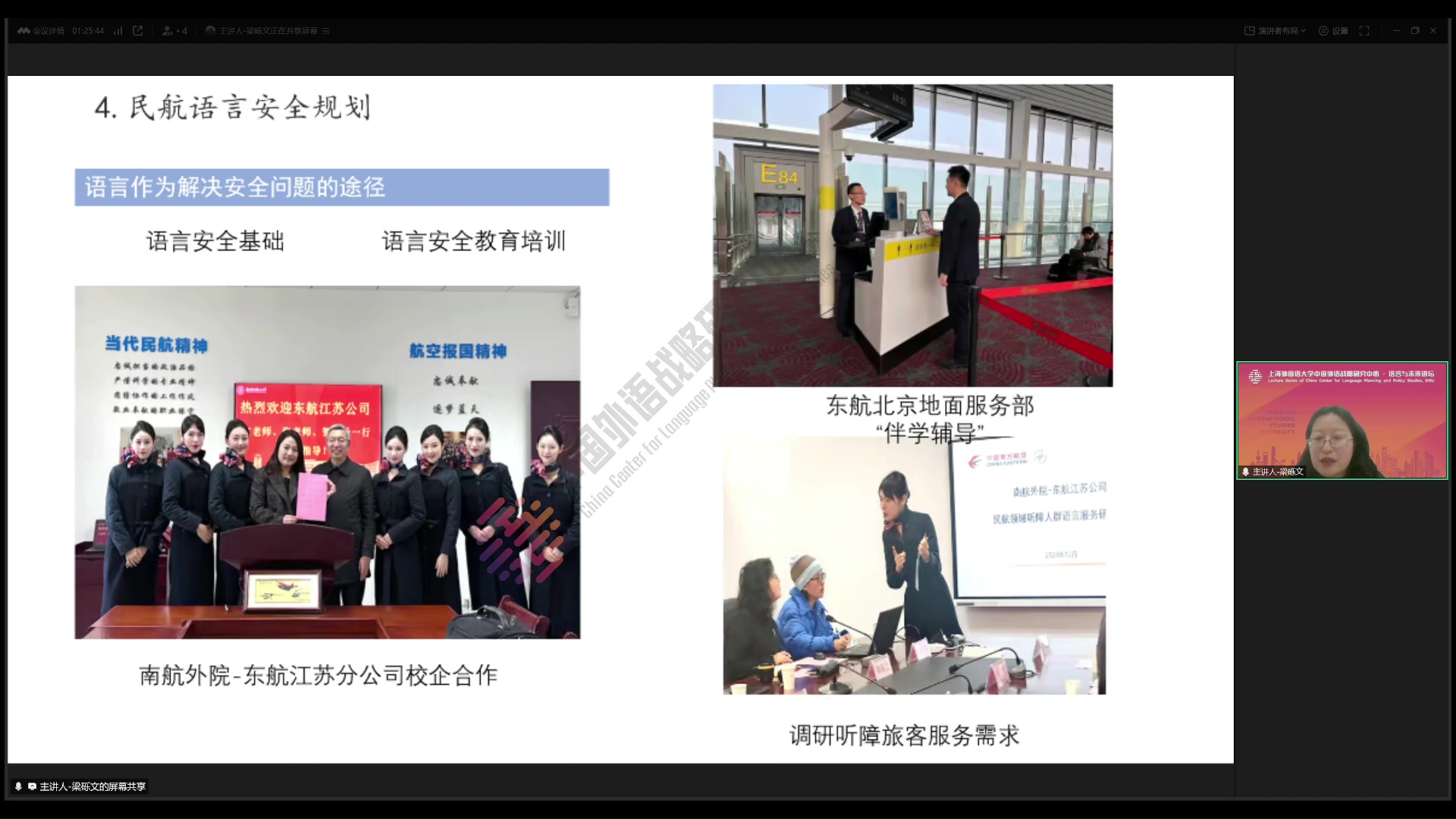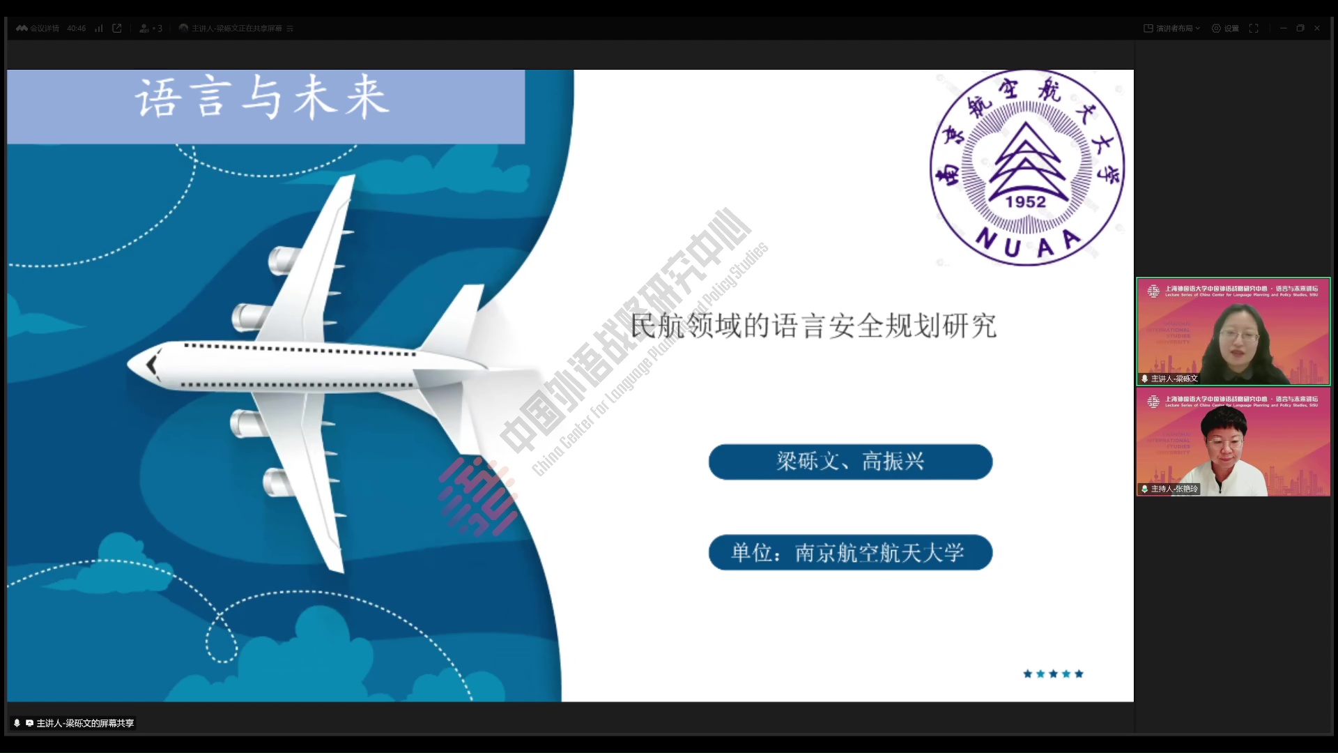 2025年3月20日,南京航空航天大学梁砾文副教授做客中国外语战略研究中心“语言与未来讲坛”,做了题为《民航领域的语言安全规划研究》的学术讲座。本次讲座由中国民航大学张艳玲教授主持,数百名师生线上参加了本次讲座。